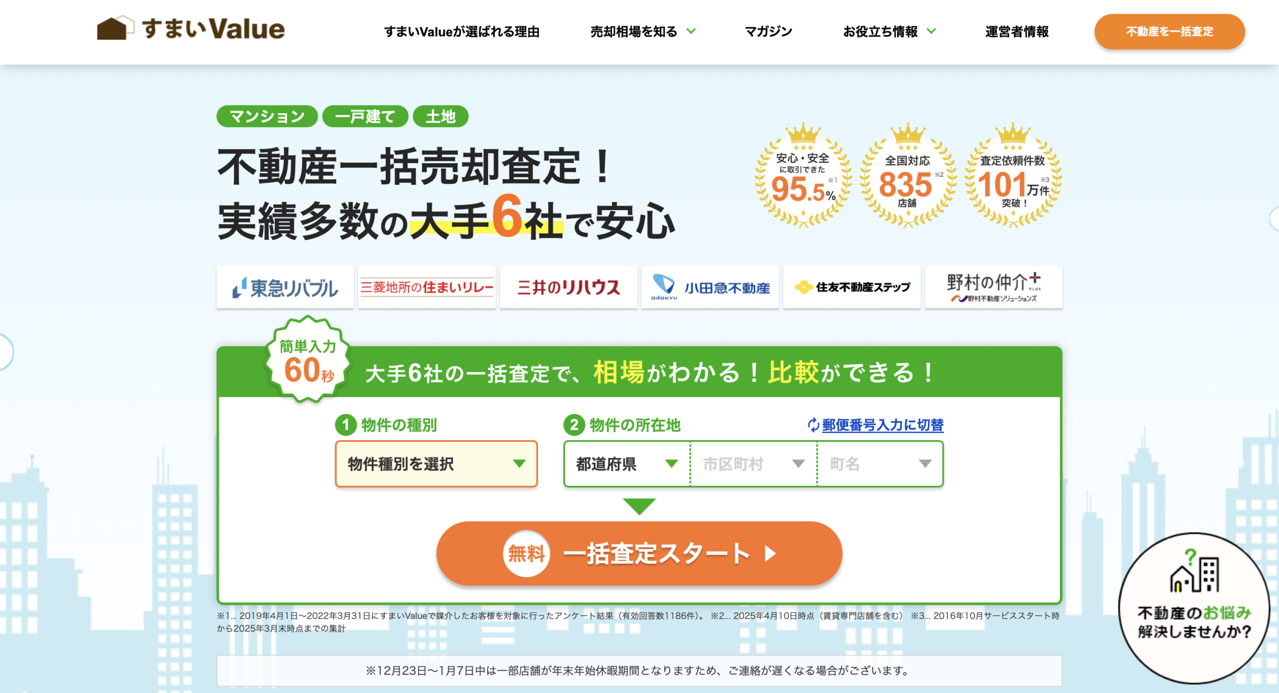 すまいValueは業界大手6社が共同で運営する一括査定サイトで、大手企業ならではの充実したサポート体制が魅力です。