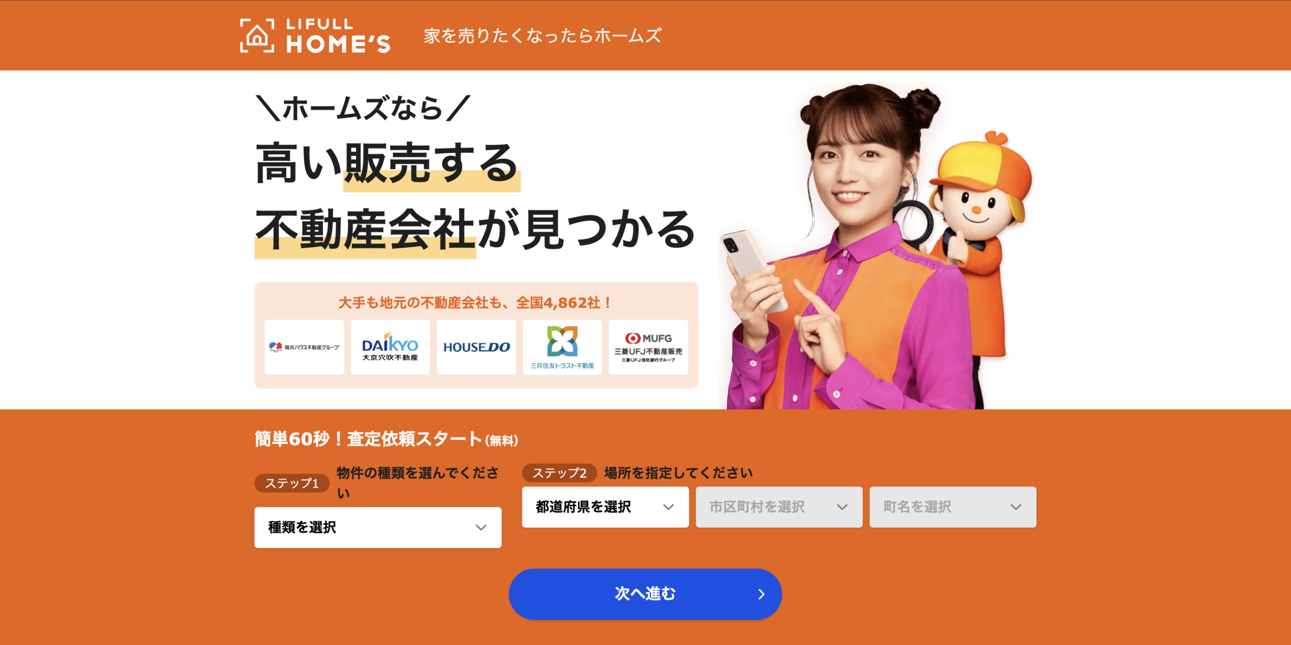 三井のリハウス、住友不動産販売、東急リバブルなど、誰もが知る有名企業に一括で査定依頼できます。